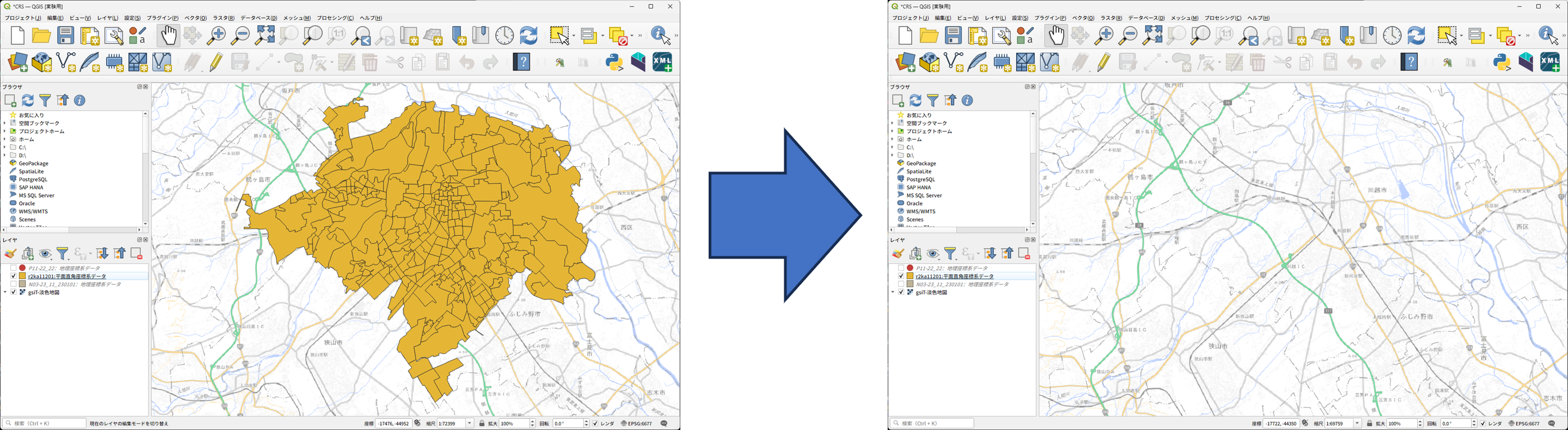 - EPSG:6676(静岡県など中部)のプロジェクトの座標参照系で作ったデータを、EPSG:6677のプロジェクトのCRSで表示したら多分太平洋の上に表示されます